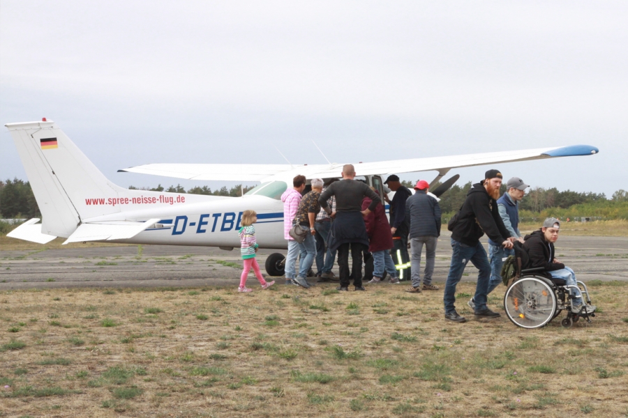Diese Textzeilen von Reinhard Mey geben in etwas das wieder, was 50 wagemutige Beschäftigte und Wohnstättenbewohner(innen) aus dem BWS empfanden, die am 8. Flugtag für Menschen mit Behinderungen teilnahmen. Am Samstag, dem 07.09.2019 fand das, inzwischen zur Tradition gewordene, Highlight auf dem Flugplatz in Welzow statt. Etwas skeptisch beobachteten alle Beteiligten das Wetter, welches sich anfänglich nicht von seiner besten Seite zeigte. Als sich am Nachmittag der Himmel aufklärte, waren alle Teilnehmer bester Stimmung und genossen bei den Flügen den schönen Ausblick auf das Lausitzer Seenland und den Tagebau. Die freiwillige Feuerwehr Welzow, die im Oktober 2019 ihr 125jähriges Bestehen feiert, lud zu Rundfahrten in zwei Einsatzfahrzeugen ein. Wie in den vergangen Jahren war auch der Pferdehof Proschim mit zwei Reitpferden vor Ort. Für das leibliche Wohl war wieder bestens gesorgt und so fand ein ereignisreicher Tag einen gemütlichen Abschluss. Wir bedanken uns an dieser Stelle recht herzlich bei den tatkräftigen Kuchenbäckern, den freiwilligen Helfern und Organisatoren.
