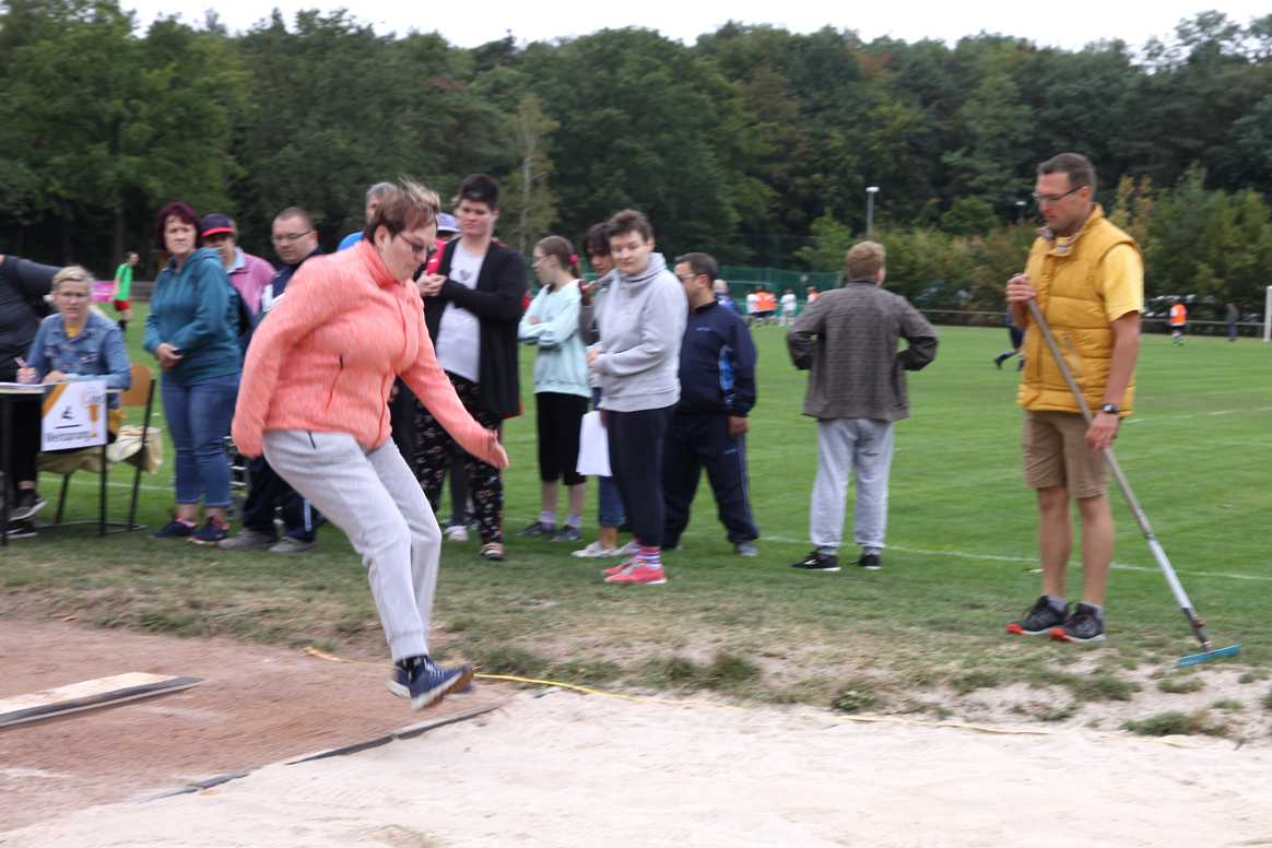 Bereits zum 23. Mal fand in diesem Jahr, am 05.09.2019, unser Sportfest statt. Ca. 450 Teilnehmer aus den Werkstätten Gallinchen, Cottbus, Guben, Weißwasser, Hoyerswerda, Herzberg, Wünsdorf, Berlin, Lübbenau, Würzburg, Spremberg, Forst, und Kolkwitz waren auch in diesem Jahr wieder interessiert und aktiv dabei. Wir starteten mit dem offiziellen Einmarsch, der Eröffnung und Erwärmung zur musikalischen Popgymnastik. Gut gelaunt und voller Power gaben alle ihr Bestes bei den Disziplinen Weitsprung, Wettlauf, Medizinballstoßen und Gummistiefelweitwurf. Auch die Angebote im Hufeisen werfen, Ballzielwurf sowie Hau den Lucas, sorgten für jede Menge Spaß und forderten zudem auch den Ehrgeiz einzelner Wettkämpfer zur Erreichung möglichst hohen Punktzahlen. Auch auf dem Rasen herrschte Fairness und Kampfesgeist zwischen den 10 Teams im Fußballturnier, denn jede Mannschaft verfolgte das Ziel, einen der ersten 3 Plätze zu belegen und mit einem Pokal nach Hause zu gehen. Wer nicht unbedingt auf dem Platz Sport treiben wollte, erfreute sich an den witzigen und spaßigen Einlagen des Alleinunterhalters und des Schlagersängers, die ihr Publikum mit Witz und Charme unterhielten. Die Siegerehrung nahm unser Vorstandsvorsitzender, Herr Hans-Werner Dobberstein, gemeinsam mit der Integrations- und Behindertenbeauftragten des Landkreises Spree-Neiße, Frau Annett Noack, vor. Wir bedanken uns an dieser Stelle bei allen Sponsoren, die mit zum Gelingen dieser sportlichen Veranstaltung beigetragen haben und ohne deren Unterstützung die Austragung dieser sportlichen Veranstaltung kaum möglich gewesen wäre.